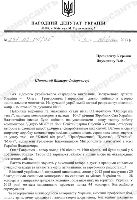 Прохання про присудження звання народного артиста України виконавцю шансона з нецензурною лексикою Олегу Гаврилюку підписали 13 народних депутатів від Партії регіонів.