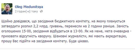 "Засідання бюджетного комітету, на якому планується затвердити "розпил" 2,2 млрд. грн., перенесли на 2 години: замість оголошених 15:00 засідання відбудеться о 13:00. Як на мене, мета очевидна - приховати відсутність кворуму", - сказав Медуниця, уточнивши, що наразі засідання знову перенесено на 15:00.