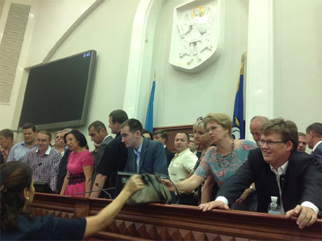 Депутати від опозиції заблокували трибуну Київради. "Батьківщина" вимагає перевиборів та припинення незаконного депутатського зібрання.