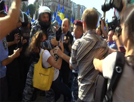 "Один здоровий лоб, десь метри два, схопив Таню Чорновіл, довелося з ним попрацювати. Таню він відпустив, а окуляри постраждали", – пояснив Яценюк.