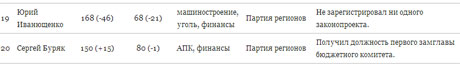 У список потрапили Сергій Тігіпко, Володимир Бойко, Василь Хмельницький, Антон Пригодський, Євгеній Сігал, Борис Колесніков, Олександр Фельдман, В'ячеслав Богуслаєв, Неcтор Шуфрич, Микола Рудьковський, Сергій Клюєв, Олександр Герега, Таріел Васадзе, Юхим Звягільський, Ігор Єремеєв, Степан Івахів, Юрій Іванющенко й Сергій Буряк.