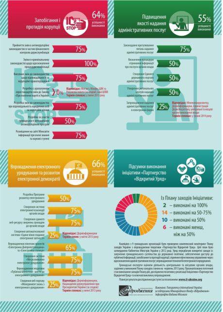 Рівень виконання заходів по розділах такий: залучення громадянського суспільства до державної політики – 55%; забезпечення доступу до публічної інформації – 38%; запобігання та протидія корупції – 64%; сприяння ефективному управлінню через вдосконалення адміністративних послуг – 55%; впровадження технологій електронного врядування – 66%.