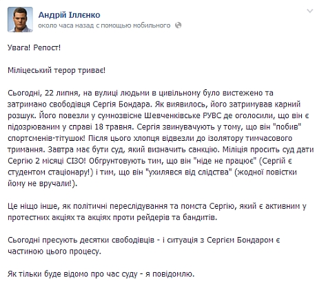 "22 липня на вулиці людьми в цивільному було вистежено та затримано "свободівця" Сергія Бондара. Як виявилось, його затримував карний розшук. Його повезли у сумнозвісне Шевченківське РУВС, де оголосили, що він є підозрюваним у справі 18 травня", - повідомив він.