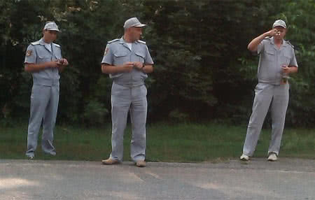 Автор зазначає, що форму піщаного кольору в ДАІ вже скасували. Крім того, у псевдо-ДАІшників відсутній жезл. Поруч з ними стоїть старий "Опель" з тимчасовими номерними знаками і наклейкою з невизначеною символікою.