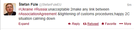 "Україна та Росія: Неприйнятно прив'язувати Угоду про Асоціацію до посилення митних процедур. Щасливий побачити, що ситуація заспокоюється", - написав він.