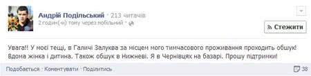 "У моєї тещі, в Галичі Залуква (селі Залуква Галицького району Івано-Франківської області – ред.) за місцем мого тимчасового проживання проходить обшук! Вдома жінка і дитина", - написав Подільський.