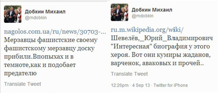 Коментуючи той факт , що в Харкові, незважаючи на перешкоди, відкрили дошку Шевельову, він написав: "Мерзотники фашистські своєму фашистському мерзотникові дошку прибили. Похапцем і в темряві, як і личить зрадникові".