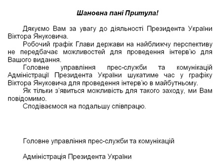 "Головне управління прес-служби та комунікацій адміністрації президента України шукатиме час у графіку Віктора Януковича для проведення інтерв’ю в майбутньому. Як тільки з’явиться можливість для такого заходу, ми вам повідомимо. Сподіваємося на подальшу співпрацю", - сказано у відповіді.