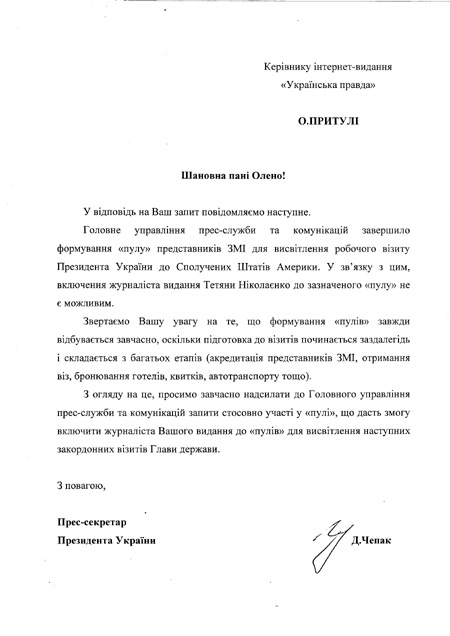 Також УП не знайшлося місця і в президентському пулі для поїздки на Генасамблею ООН, хоча редакція подала заявку 6 вересня.