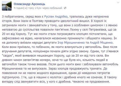 "З побратимами трапилась дуже неприємна історія. Вони їхали в Полтаву проводити ідеологічний вишкіл. В Хоролі їх затримали мєнти і звинуватили у тому, що вони з особливим цинізмом і з явною неповагою до суспільства повалили пам'ятник Лєніну у селі Петракеївка, що за 20 км від Хоролу", - пише Аронець.