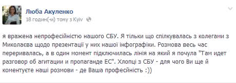 "Я тільки що спілкувалась з колегами з Миколаєва щодо презентації у них нашої інфографіки. Розмова весь час переривалась, а в один момент підключилась лінія на який я почула: "Там идет разговор об агитации и пропаганде ЕС", - розповіла вона.