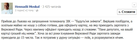 "Вирішив пообідати, а оскільки майже не ношу з собою готівки, дав офіціанту картку, на яку приходить зарплата з Верховної Ради. Через хвилину офіціант приходить назад зі словами: "Пане депутате, на вашій картці грошей ніц немає", - пише Москаль.
