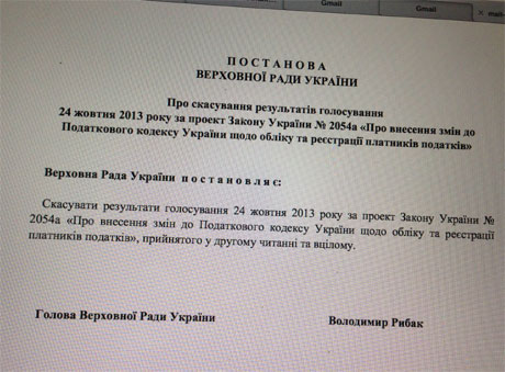 "Скасувати результати голосування 24 жовтня 2013 року за проект закону №2054а про внесення змін до Податкового кодексу щодо обліку та реєстрації платників податків, прийнятого в другому читанні та вцілому",- сказано в проекті постанови.