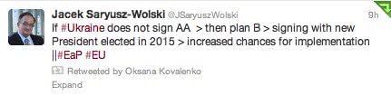 "Якщо Україна не підпише угоду про асоціацію з ЄС, буде план Б – підписання з новим президентом, якого оберуть у 2015 році. Це підвищує шанси для імплементації", - написав він.