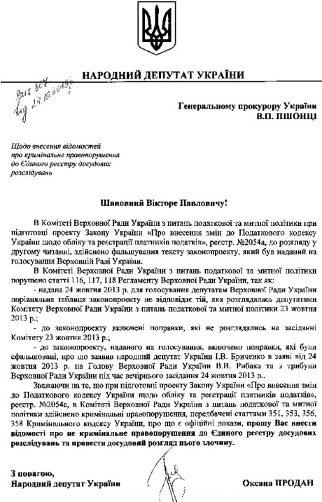 "Зважаючи на те, що при підготовці проекту закону про внесення змін до Податкового кодексу щодо обліку та реєстрації платників податків" в комітеті ВР х питань податково та митної політики здійснено кримінальні правопорушення , передбачені статтями 351, 353, 356, 358 Кримінального кодексу, про що є офіційні докази", - зазначила Продан.