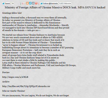 Хакери з групи Anonimous стверджують, що зламали українського провайдера EuroTraceTelcom, завдяки чому отримали доступ до листів, розташованих на домені українського Міністерства закордонних справ mfa.gov.ua.