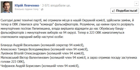 "Сьогодні деякі технічні партії, які отримали місця в нашій Окружній комісії, здійснили заміни", - пише Левченко.