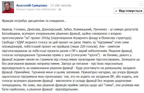"Учора фракція одноголосно підтримала мою пропозицію: тих, хто не ходить на засідання ВР, або ходить, але голосує всупереч рішенням фракції - виключати зі складу фракції без жодних додаткових попереджень. Не знаю, яке рішення фракція прийме завтра щодо цієї "сімки", але розмова має бути серйозною, а рішення фракції - відповідальним", - заявляє Гриценко.