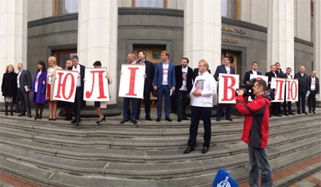 Між тим депутати перед Верховною Радою вистроїлися з написом "Юлі Волю"
