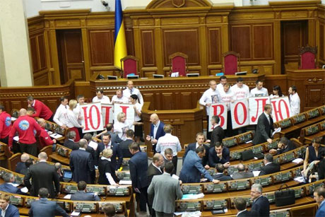 Перед початком засыдання депутати від опозиції вийшли лдо трибуни зі словами "Юлі Волю".