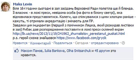 У той же час журналіст Макс Левін на своїй Facebook-сторінці повідомив, що об'єктив, деталь якого у вівторок впала до сесійної зали, належить юнаку, який фотографує у Верховній Раді для потреб Партії регіонів.