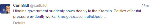 Міністр закордонних справ Швеції Карл Більдт впевнений, що рішення уряду Азарова відмовитись від Євроінтеграції пов’язано з тиском Росії.