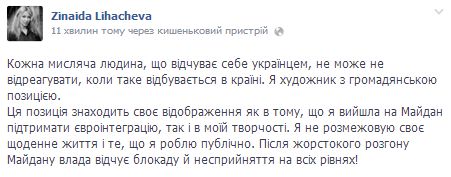 "Я художник з громадянською позицією. Ця позиція знаходить своє відображення як в тому, що я вийшла на Майдан підтримати євроінтеграцію, так і в моїй творчості. Я не розмежовую своє щоденне життя і те, що я роблю публічно. Після жорстокого розгону Майдану влада відчує блокаду й несприйняття на всіх рівнях!", - написала вона.