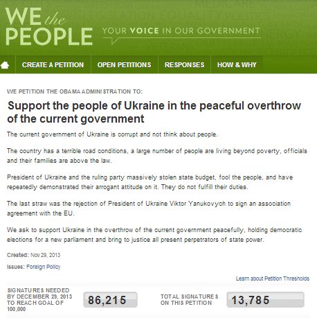 На сайті Білого дому зареєстрована нова петиція з проханням підтримати народ України в мирному поваленні нинішнього уряду.