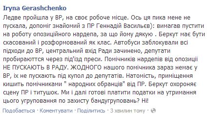"Помічників нардепів від опозиції НЕ ПУСКАЮТЬ В РАДУ. ЖОДНОГО нашого помічника зараз немає у ВР, їх не пускають під купол до депутатів. Натомість, приміщення кишить помічниками "народних обранців" від Партії регіонів", - зазначила депутат.