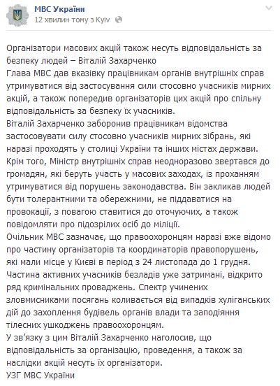 Очільник МВС зазначає, що "правоохоронцям наразі вже відомо про частину організаторів та координаторів правопорушень, які мали місце у Києві в період з 24 листопада до 1 грудня".