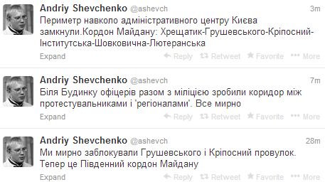 Після нього опозиціонер Андрій Шевченко повідомив, що станом на неділю адміністративний центр Києва заблокований мирними протестувальниками.