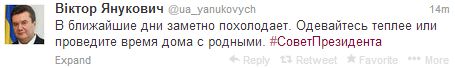 У Твітері Янукович радить одягатися тепліше або сидіти вдома