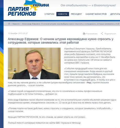 Спочатку на сайті висів коментар Єфремова ВВС, в якому він засудив дії правоохоронців під час спроби штурму євромайдана в ніч з вівторка на середу.