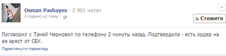 У свою чергу ще один активіст Зорян Шкиряк у своєму Facebook написав: "Відома українська журналістка, розслідувачка брудних справ Януковича і його "родини", Тетянка Чорновол, в реальній небезпеці! Надійшла достовірна інфа, що є ордер на іі арешт. Справу веде СБУ".