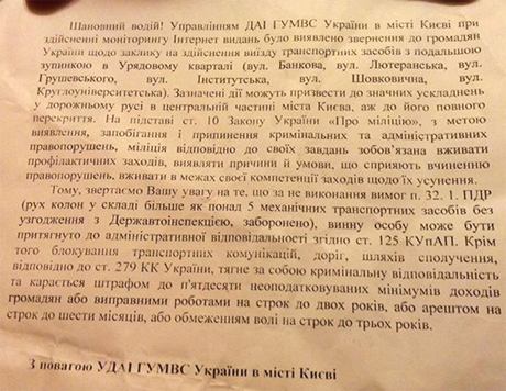 "Зрозуміло, що масовий виїзд до центральної частини міста на транспорті призведе до значних ускладнень у дорожньому русі і може паралізувати подальше пересування всього транспорту. Тому, нагадуємо ініціаторам подібних закликів, що на підставі ст. 10 Закону України "Про міліцію", з метою виявлення, запобігання і припинення кримінальних та адміністративних правопорушень, міліція відповідно до своїх завдань зобов’язана вживати профілактичних заходів, виявляти причини й умови, що сприяють вчиненню правопорушень, вживати в межах своєї компетенції заходів щодо їх усунення", - зазначили у ДАІ.