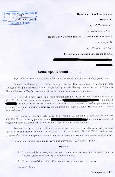 "Після цього 24 грудня 2013 року о 4 годині 32 хвилини з телефонного номера 0692554872 також моєму родичу (матері) на такий самий номер подзвонила невідома особа, яка погрожувала облити мене кислотою", - додав Білоцерковець у своїй заяві.