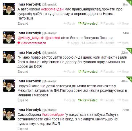"Парубій каже, що деякі автобуси, які мали везти активістів у Межигір'я, затримала ДАІ. Півтори сотні активістів розміщуються в машини і мікроавтобуси", - написала Неродик.
