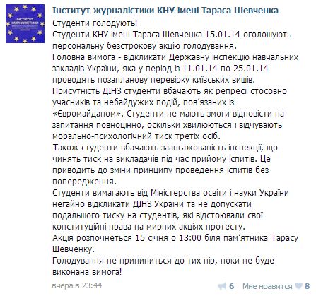 "Акція розпочнеться 15 січня о 13:00 біля пам’ятника Тарасу Шевченку. Голодування не припиниться до тих пір, поки не буде виконана вимога!", - інформують студенти.
