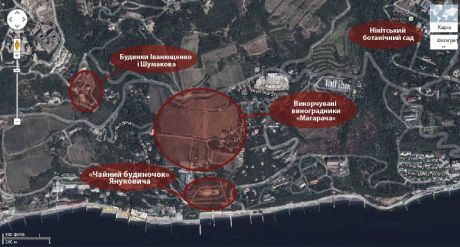 Трохи нижче від цієї ділянки на березі моря знаходиться "Чайний будиночок" Віктора Януковича, зведений на колишній території державної агрофірми "Магарач".