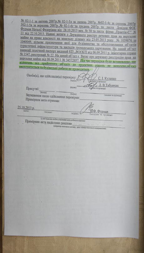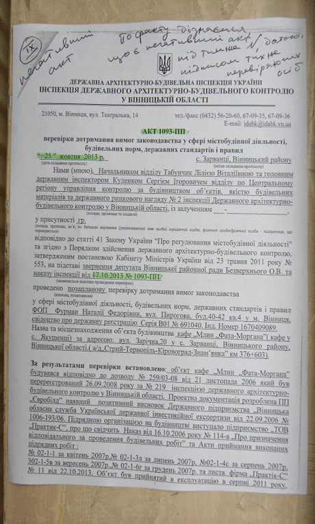 Фурман стверджує, що у жовтні Державний архітектурно-будівельний контроль проводив перевірку його кафе й не виявив порушень, про що був складений відповідний акт.