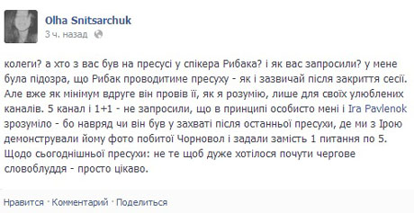 За словами Сніцарчук, 5 канал та 1+1 не були запрошені на пресс-конференцію з Рибаком у четвер, бо минулого разу вона і її коллеги "демонстрували йому фото побитої Чорновол і задали замість 1 питання по 5".