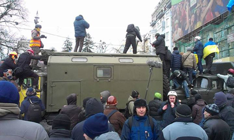 Разом з тим люди намагалися перелізти через КамАЗи та прорватися крізь кордон, що стоїть на вул. Грушевського та перекриває урядовий квартал.