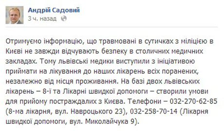 "Отримуємо інформацію, що травмовані в сутичках з міліцією в Києві не завжди відчувають безпеку в столичних медичних закладах. Тому львівські медики виступили з ініціативою приймати на лікування до наших лікарень всіх поранених, незалежно від місця проживання", - повідомив він, надавши контакти та андреси відповідних закладів.