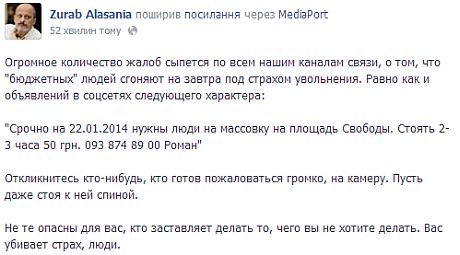 Також існують оголошення про платну масовку на цьому мітингу, за участь в акції обіцяють заплатити 50 гривень за 2-3 години.
