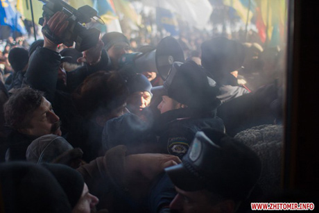 Дізнавшись про відмову депутатів розглянути питання про ситуацію в країні, пікетники намагаються прорватися в будівлю обласної ради.
