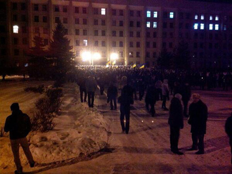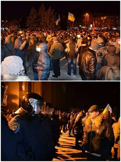 Перед входом в адміністрацію вишикувавлося декілька рядів міліціонерів у шоломах і з щитами. Перед початком віче мітингуючих закликали не вдватись до силових дій.