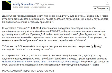 "19.01.2014 невстановлені досудовим розслідуванням особи організували натовп у кількості приблизно 3000-5000 осіб для вчинення масових заворушень, до складу якого увійшов Юрченко Д.М. та інші невстановлені особи", - цитує Странніков матеріал підозри.