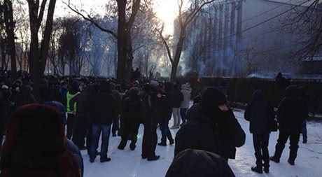 Також на місці перебувають близько 200-250 хлопців спортивної статури, їх прикриває міліція.