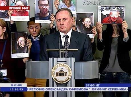 На брифінгу глави фракції Партії регіонів Олександра Эфремова представники ЗМІ влаштували акцію протесту проти застосування сили і нападів на журналістів.