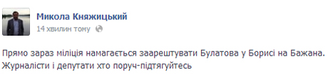 "Прямо зараз міліція намагається заарештувати Булатова у Борисі на Бажана. Журналісти і депутати хто поруч – підтягуйтесь", - зазначив він о 17:41.